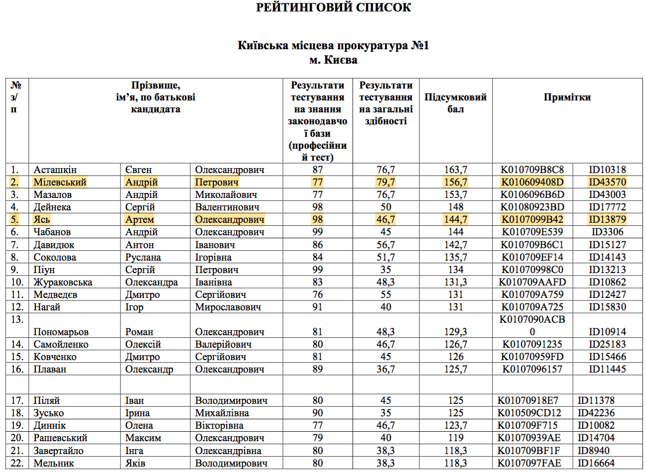 В списке Киевской местной прокуратуры № 1 на пятом месте (144,7 балла) расположился Артем Ясь – сын люстрированного заместителя прокурора Черниговской области Александра Яся. Сам Артем сейчас занимает должность начальника управления прокуратуры Киевской области.