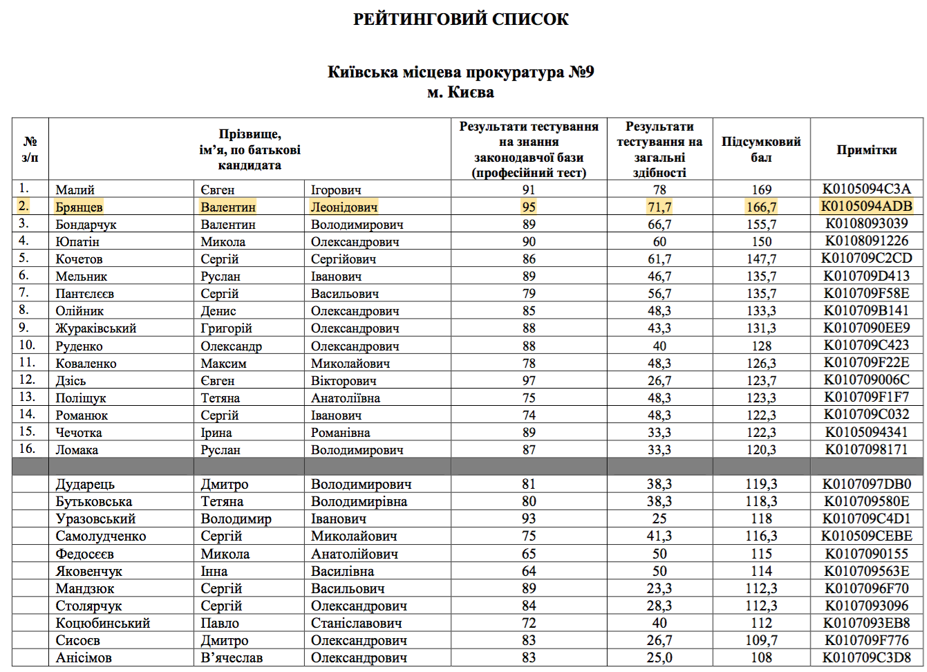 На втором месте в списках Киевской местной прокуратуры № 9 с результатом в 166,7 баллов значится Валентин Брянцев – старший прокурор прокуратуры Подольского района Киева. Он запомнился преследованием националистов и даже выступил обвинителем по делу «Украина без Кучмы» против УНА-УНСО за события 9 марта 2001 года. В свое время он получил закрытую черепно-мозговую травму и многочисленные ушибы во время акции по «люстрации» от «Святошинских робингудов».