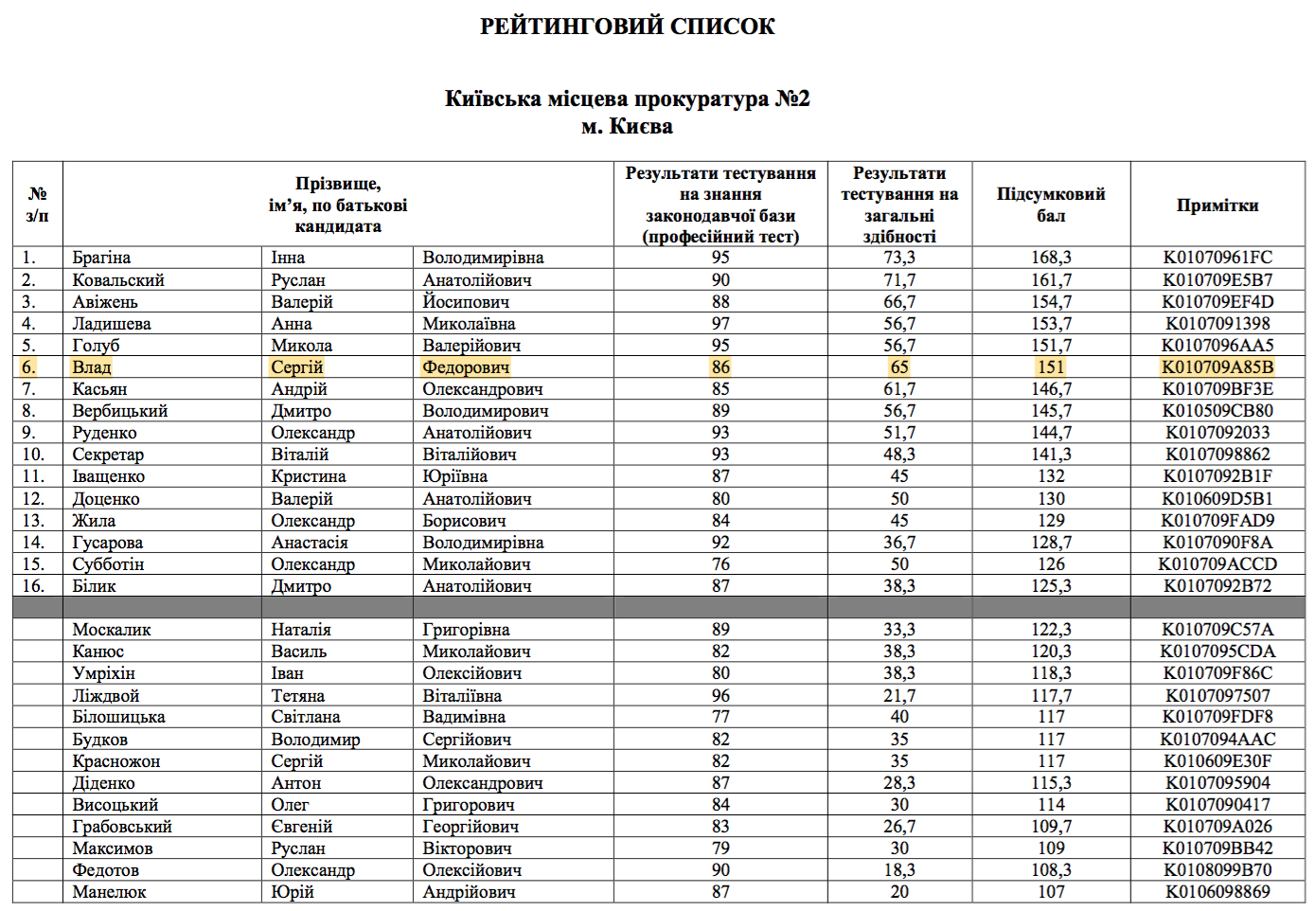 Старший прокурор Дарницкой прокуратуры Сергей Влад – сын экс-заместителя главы АМКУ Федора Влада, претендует на руководящую должность в Киевской местной прокуратуре № 2. Сергей занял в рейтинговом списке 6 место, набрав 151 балл.