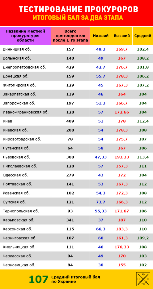 Если рассматривать результаты по регионам, то лучший средний результат второго этапа показала столица – 33,3, а Ивано-Франковская область оказалась худшей, показав 25 баллов среднего результата. Минимальное количество баллов составило 5. Правда некоторые прокуроры просто не пришли на второе тестирование.