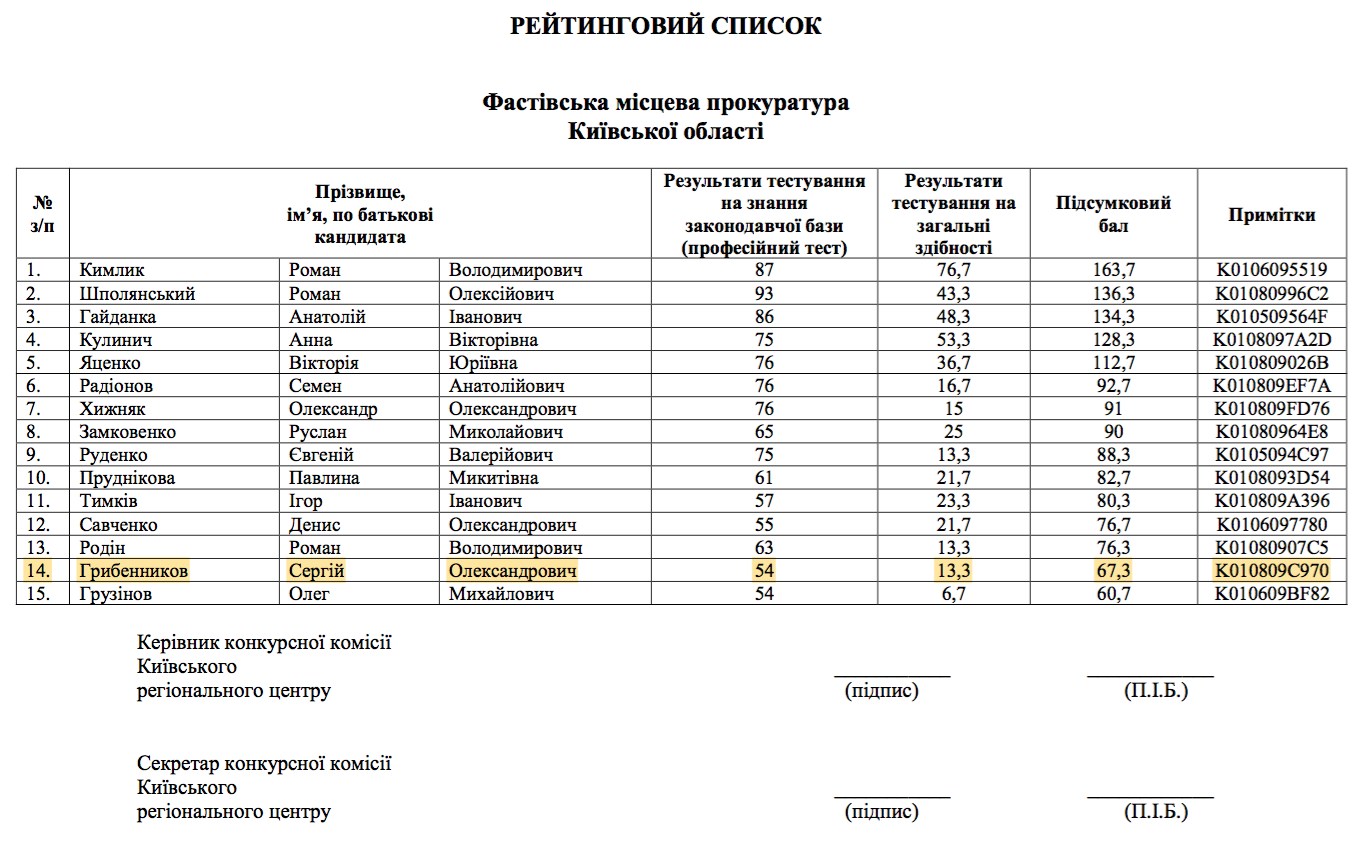 Не смотря на очень низкий результат в 67,3 балла, руководителем Фастовской местной прокуратуры Киевской области может стать Сергей Грибенников, заместитель Фастовского межрайонного прокурора – сын Александра Грибенникова, экс-начальника УВД г. Белая Церковь и брат Анатолия Грибенникова, прокурора прокуратуры Деснянского района Киева (вел дела против майдановцев). Сергей занимает 13 место из 15 претендентов.