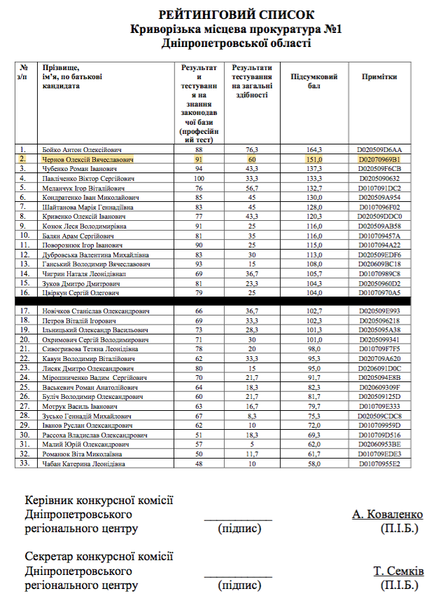 Претендует на руководящие должности Криворожской местной прокуратуры №1 Днепропетровской области прокурор Днепропетровска Алексей Чернов – сын Вячеслава Чернова, в прошлом помощника-консультанта народного депутата Украины от Партии Регионов, председателя Международной общественной организации «Землячество Приднепровья» Вячеслава Задорожного. Алексей занял в списке 2-е место, набрав 151 балл.