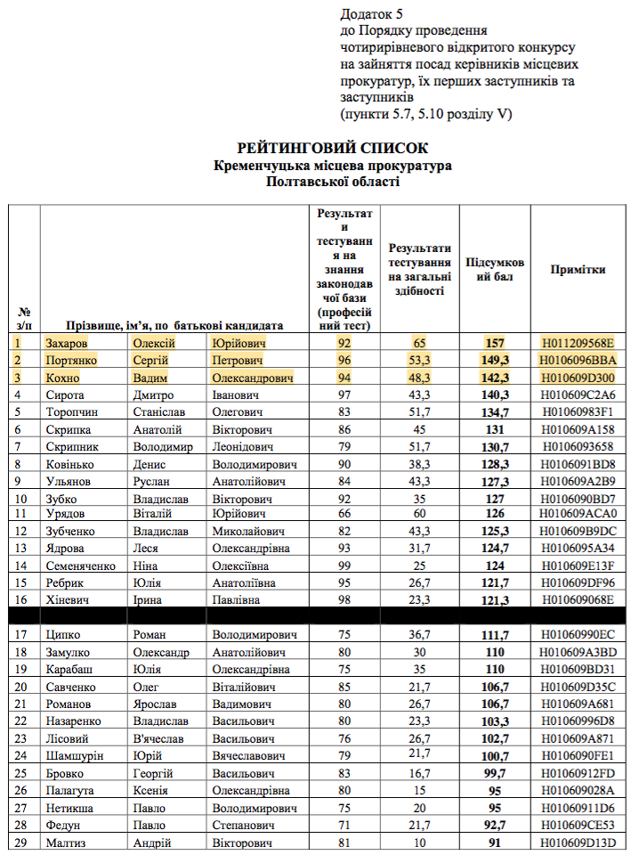 Лучшие результаты в списке Кременчугской местной прокуратуры показали бывший прокурор одного из районов Луганской области, ныне – участник АТО Алексей Захаров (157 балла), бывший работник милиции, ныне – адвокат Сергей Портянко (149,3 балла) и бывший прокурор Вадим Кохно (142,3 балла).