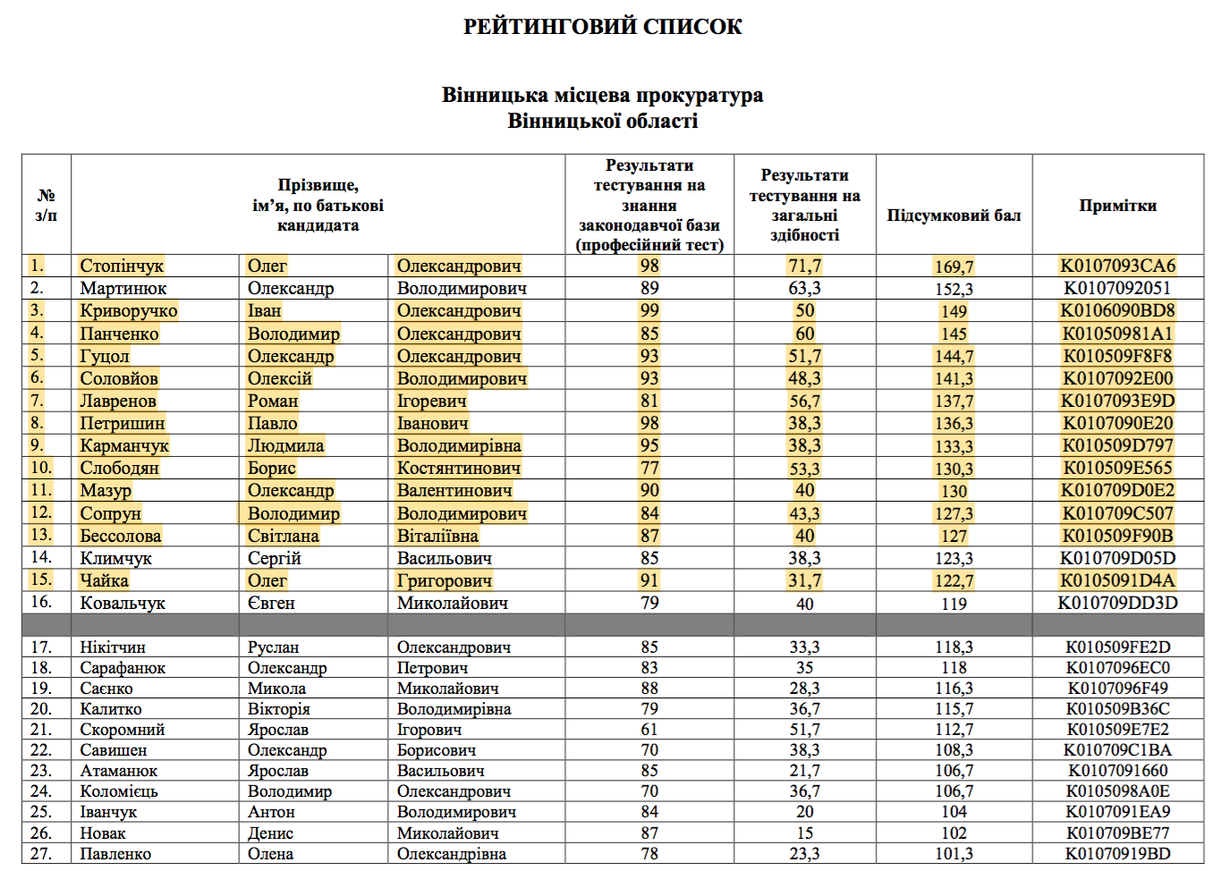 Среди представителей 16-ти лучших претендентов на руководящие должности местных прокуратур Винницкой области абсолютное большинство имеет влиятельных родственников или многолетний опыт работы в правоохранительных органах. В частности, лидерами второго этапа открытого конкурса ГПУ стали прокурор Липовецкого района Винницкой области Иван Криворучко, который во времена Януковича был начальником отдела защиты прав и свобод детей прокуратуры Винницкой области; сын нотариуса Игоря Лавренова – Роман Лавренов; сын бывшего заместителя председателя Винницкого апелляционного суда Ивана Петришина – Павел Петришин; сын судьи Винницкого апелляционного суда Владимира Сопруна – Владимир Сопрун; жена депутата Винницкого горсовета Стапана Бессолова – Светлана Бессолова; руководитель аппарата Хозяйственного суда Винницкой области Сергей Климчук. Кроме того, в списках есть многолетние работники прокуратуры Людмила Карманчук, Александр Гуцол, Алексей Соловьев, Олег Чайка, а также именитые винницкие адвокаты Борис Слободян, Александр Мазур. Больше всего баллов (169,7) набрал старший следователь по особо важным делам следственного отдела прокуратуры Винницкой области 27-летний Олег Стопинчук. Интересным являет тот факт, что Олег Стопинчук женат на единственной дочери заместителя Винницкого городского головы Андрея Ревы – Наталье. Не повлияло ли это обстоятельство на столь высокий рейтинг молодого прокурора?