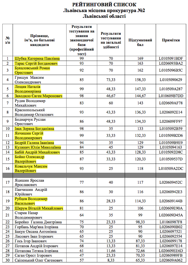 Первые три места в списке Львовской местной прокуратуры № 2 заняли действующие прокурорские работники. Первое место досталось Катерине Шубке – старший прокурор прокуратуры Львова. На второе место взобрался Сергей Тарас – старший прокурор прокуратуры Сыховского района Львова. Ну а третье место занял Роман Букаловский – старший прокурор прокуратуры Львова. Всего в этом списке из 16 претендентов 12 это работники прокуратуры.