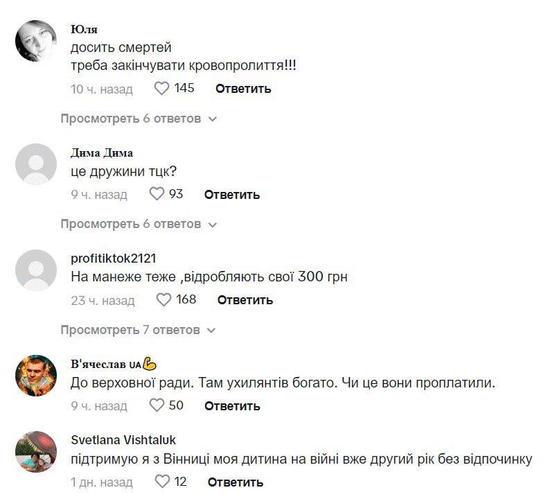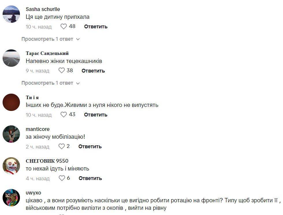 "Почему бы не кричать "мира, конец войне!"?"; "Девочки, сколько сегодня стоит один такой рабочий день?"; "Хотя бы один митинг был за мир"; "Уклонисты требуют мобилизации уклонистов. Я в ступоре"; "Вот и 200 грн заработали"; "Это что, жены ТЦКшников?"; "Уклонисты - это те, кто давали присягу народу Украины", - пишут люди.