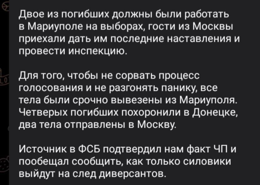 В одной из квартир временно оккупированного Мариуполя обнаружили тела шести человек, отравившихся едой и напитками, заказавшими из ресторана. Двое из них были местными активистами российской партии "Единая Россия", еще четверо – "важные гости" из Москвы, приехавшие дать указания по проведению выборов. Были среди них и работники ЦИК РФ
