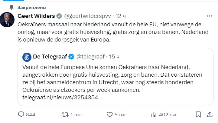 "Украинцы стекаются в Нидерланды со всего ЕС не из-за войны, а ради бесплатного жилья, бесплатной медицины и рабочих мест. Нидерланды снова стали сельским идиотом Европы", — написал он в Х.
