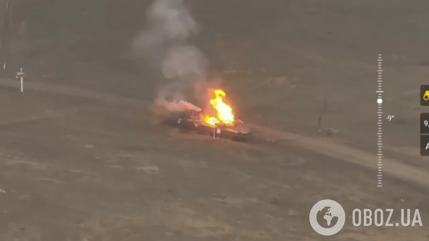 После первого удара над одним из танков начал подниматься дым. Второе попадание FPV-дрона было еще ярче. Вероятно, боекомплект российского танка сдетонировал.