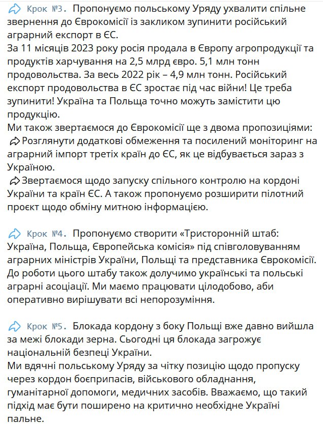 6. Создать трехсторонний штаб (Украина, Польша, ЕС), который найдет решение о беспрепятственном пропуске других групп товаров. Трехсторонний штаб должен работать круглосуточно, и вопрос блокирования границы должен быть решен значительно раньше, чем 28 марта — даты, когда должно было состояться совместное заседание правительств Украины и Польши. В противном случае Украина оставляет за собой право применять зеркальные меры по пунктам пропуска.