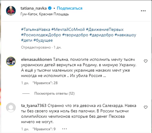 "Татьяна, помогите осуществить мечту тысяч украинских детей вернуться на Родину, в мирную Украину. А еще у тысячи маленьких украинцев никаких мечт уже никогда не сбудется. Их убила Россия", "Я думаю, многие люди боялись бы мечтать вместе с вами. Это угроза для жизни. И это все что вы можете сделать для этой девочки? Покататься с ней на коньках?", - высмеивают Навку пользователи.