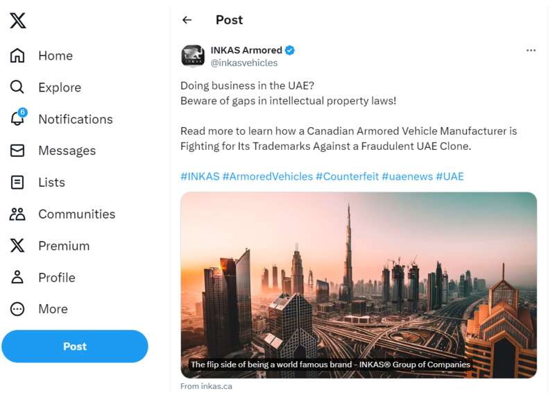 Так, канадская компания предупреждает на своих официальных ресурсах, что компания "Инкас Дубай", которая продолжает презентовать свою продукцию на выставках под торговой маркой INKAS, является пародией на настоящий бренд. Отдельно упоминается владелец дубайской структуры Улугбекхон Максумов.