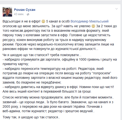 Про це на своїй сторінці у Facebook написав Роман Сухан, який працював кореспондентом на «5 каналі». Він також поскаржився на важкі умови праці на каналі, що належить президентові Петру Порошенку. За словами Сухана, свої скарги він раніше виклав у листі до директора каналу, після чого його звільнили.