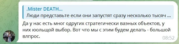 "Говоря проще – нужно работать с населением и честно разъяснять, что ударов по глубинной инфраструктуре будет больше и больше, что это наша новая нормальность, которую придется признать (…) Нужно готовить бункеры для школ в Сибирь, нужно готовить ремонтно-восстановительные спецкоманды для заводов, надо учить население жить в условиях, будто у нас война. Это лучше, чем пожертвовать людьми и техникой на фронте, которых в случае отвода ПВО намолотят в промышленных масштабах без каких-либо прямых боев", - написал оккупант.
