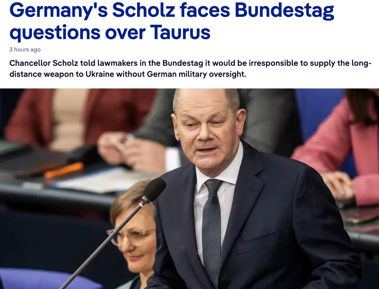 Издание DW пишет, что Шольц в очередной раз заявил, что против поставки Украине Taurus - даже если немецкие военные будут задействованы в их применении за пределами Украины.