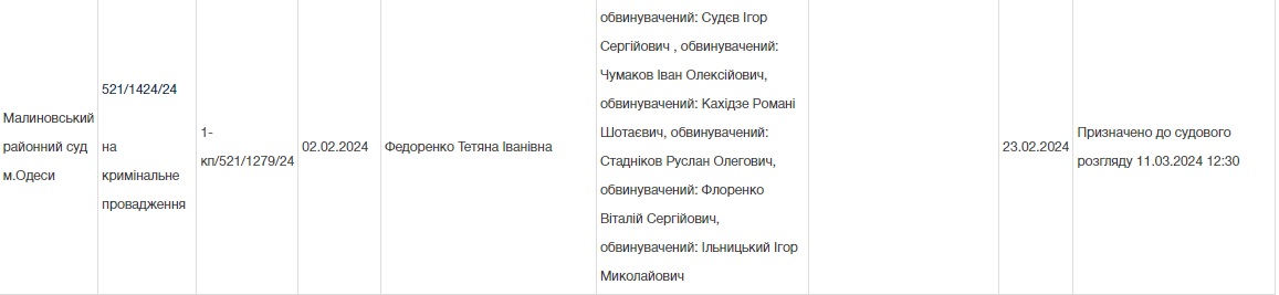Согласно материалам портала "Судебная власть", обвинительный акт в отношении 5 авторитетов ("Подушки", "Гнома", "Мотыля", "Вани Русского" и "Ромы Батумского"), а также эпизод в части организации "казино" сообщником "Мечу" - Игорем Судевым, в начале февраля 2024 года правоохранители направили в Малиносский районный суд Одессы.