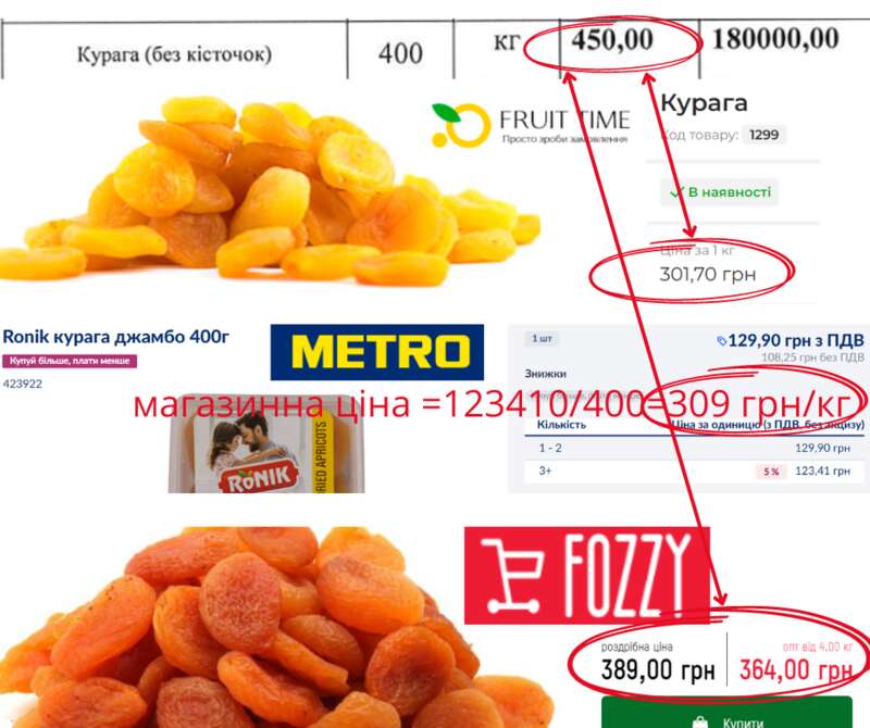 Интернет-магазин «Fruit Time» продает курагу по 302 грн/кг , что на 33% дешевле, а ТЦ Metro по 309 грн/кг , что на 31% дешевле. Сеть гипермаркетов «Fozzy» предлагает ее по оптовой цене 364 грн/кг , что на 19% дешевле. Управление образования Фастовского горсовета недавно заказывало курагу по 294 грн/кг , что в полтора раза дешевле, а детский сад «Родничок» Боярского горсовета Киевской области по 240 грн/кг , что почти вдвое дешевле.