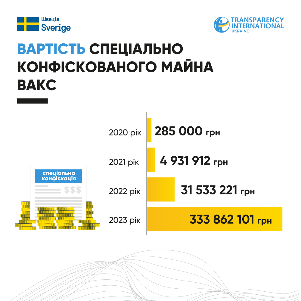 Применять же специальную конфискацию ВАКС может в случае совершения какого-либо из подсудимых ему преступлений, кроме похищения официальных документов (части 1 и 3 статьи 357 Уголовного кодекса Украины). Однако статью Антикорсуд применил только в 22 приговорах (по состоянию на 31 декабря 2023 года).