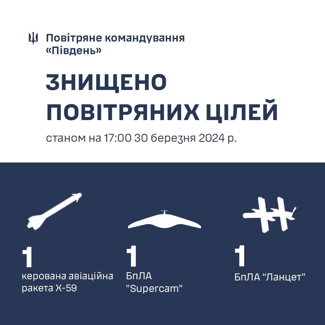 Как сообщили в командовании Воздушных сил ВСУ, в течение сегодняшнего дня силами и средствами ПВО воздушного командования "Юг" были уничтожены: