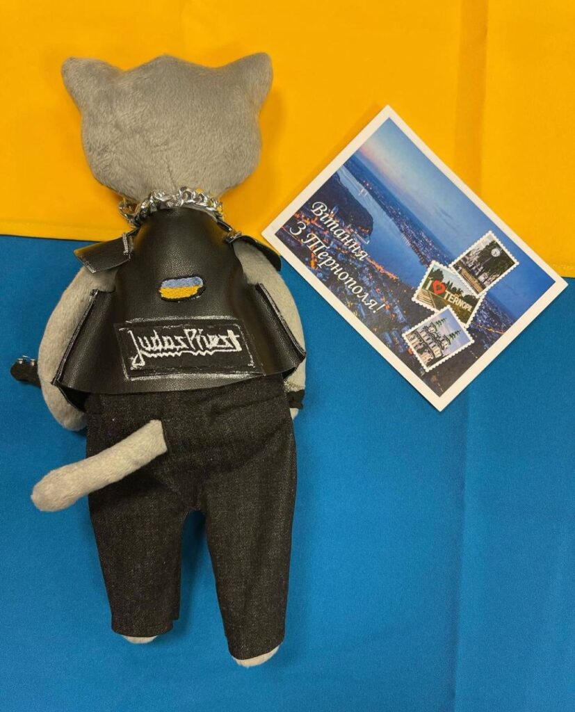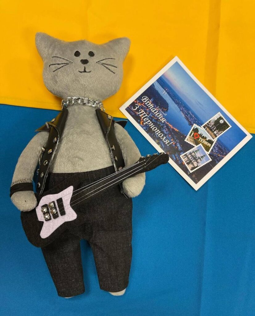 На игрушечном котике сзади изображен флаг Украины и название группы, пишет издание Буквы . Также на фото видна открытка, на которую написано "Поздравление из Тернополя".