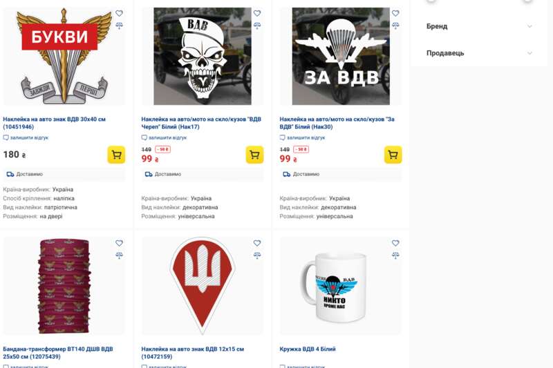 Местами продавцы товаров стилизовали российские картинки под украинские, просто вставив трезубец или флаг Украины. К примеру, жетон с надписью ДШВ (десантно-штурмовые войска) с изображением летучей мыши, являющейся эмблемой русского рода войск.