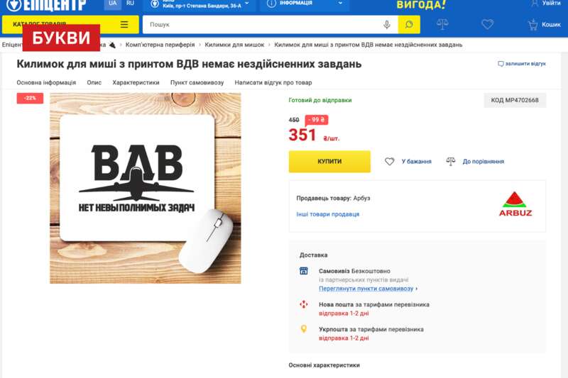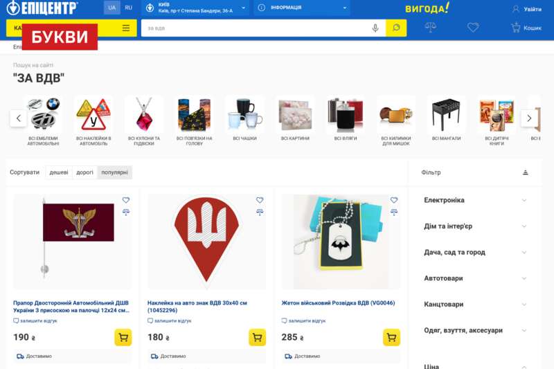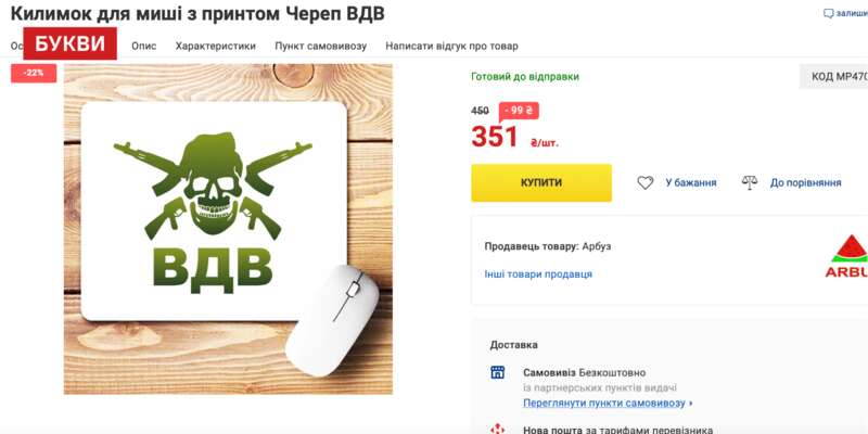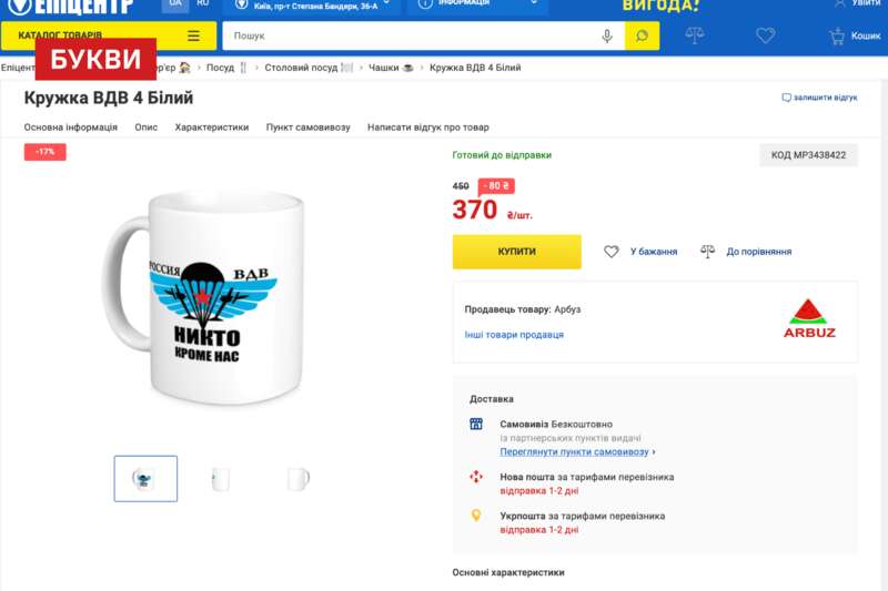 На сайте украинского гипермаркета "Эпицентр" продают товары с российской символикой, в частности десантных войск РФ.