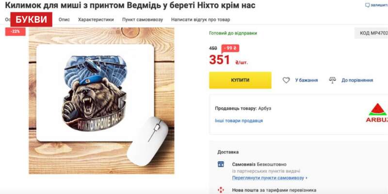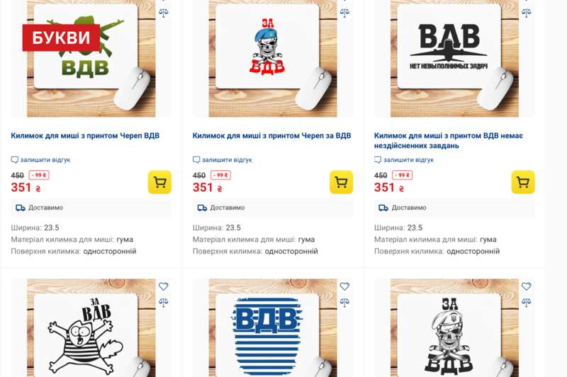 На сайте можно увидеть коврики для компьютерной мышки с надписями "никто кроме нас", "ВДВ" и т.д. и изображениями российских военных, медведя в берете, девушки с кокошником и автоматом.