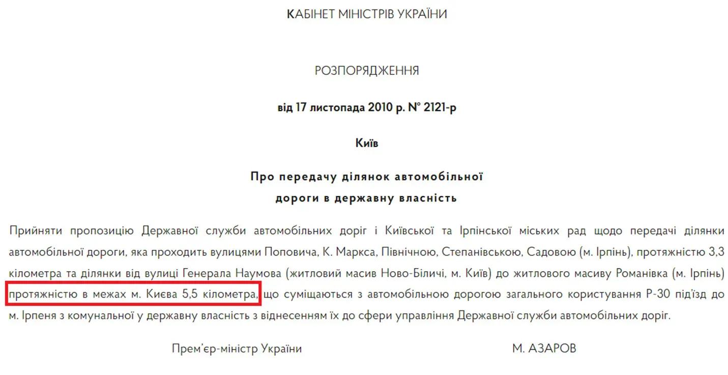 Отдельное распоряжение Кабмина от 2010 года, где речь идет о трассе Р-30 в пределах Киева
