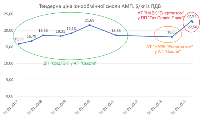 В июне 2023 года «Энергоатом» заказывал такую же смолу для «ВостокГОК» непосредственно у «Смол» по 660 грн, или $18,05 за килограмм, что на 20% дешевле в долларах. Но тогда срок послеоплаты был короче: товар должны были оплатить в течение 30 рабочих дней после поставки.