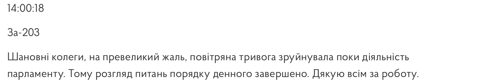 В стенограммах встречаются и случаи, когда председательствующий во время объявления перерыва из-за воздушной тревоги отмечал, что собраться после тревоги депутаты уже не смогут, поэтому работа прекращалась уже на этом этапе.