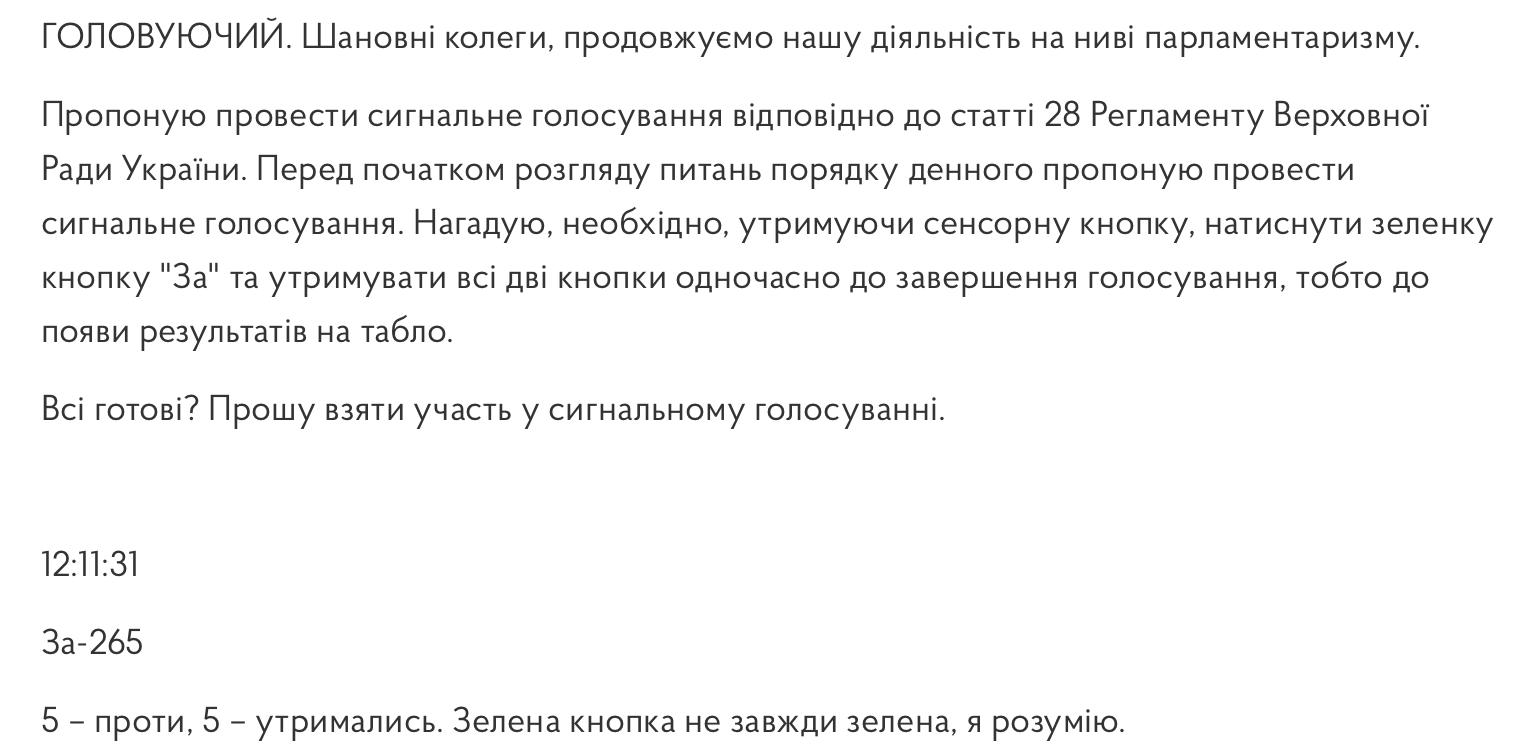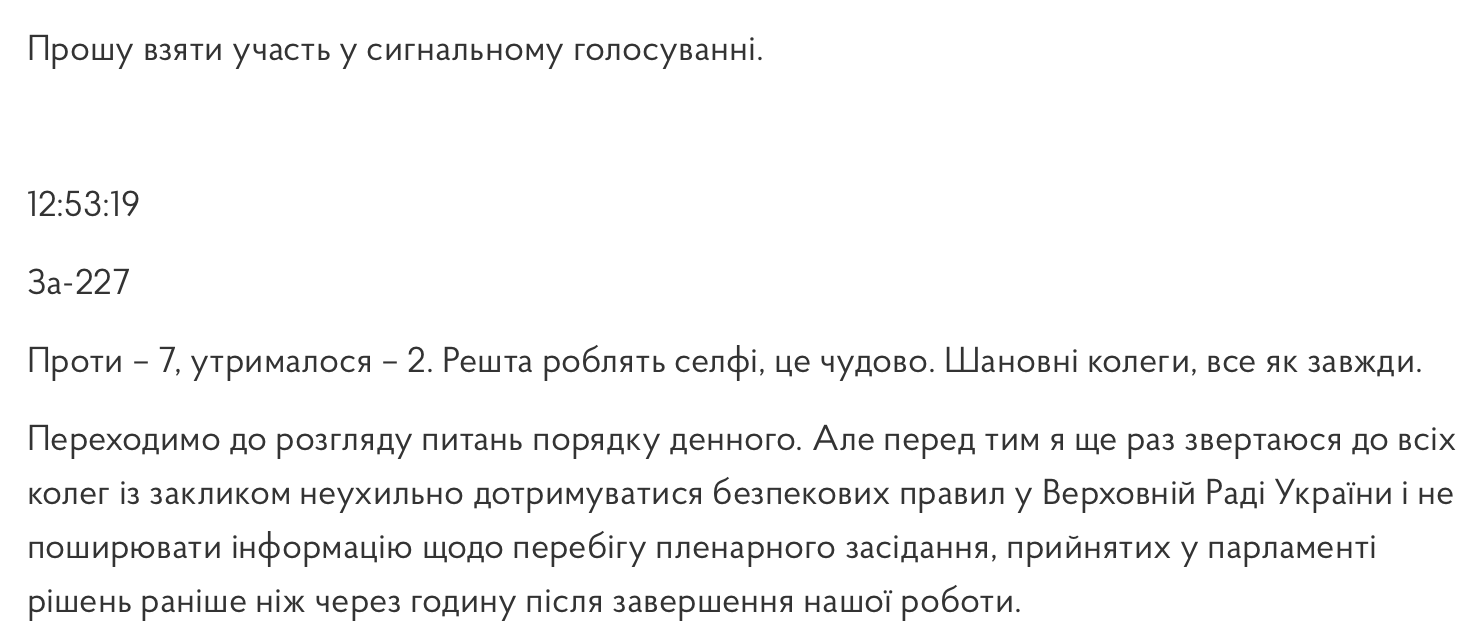 Иногда и сигнальные голосования не обходятся без курьезов. Так, например, во время одного из них — 24 августа, в День независимости Украины — председатель упрекнул, что в момент голосования часть депутатов делают селфи.