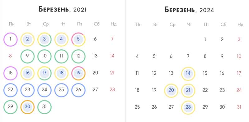 Сравнение количества заседаний в марте 2021 г. и марте 2024 г.