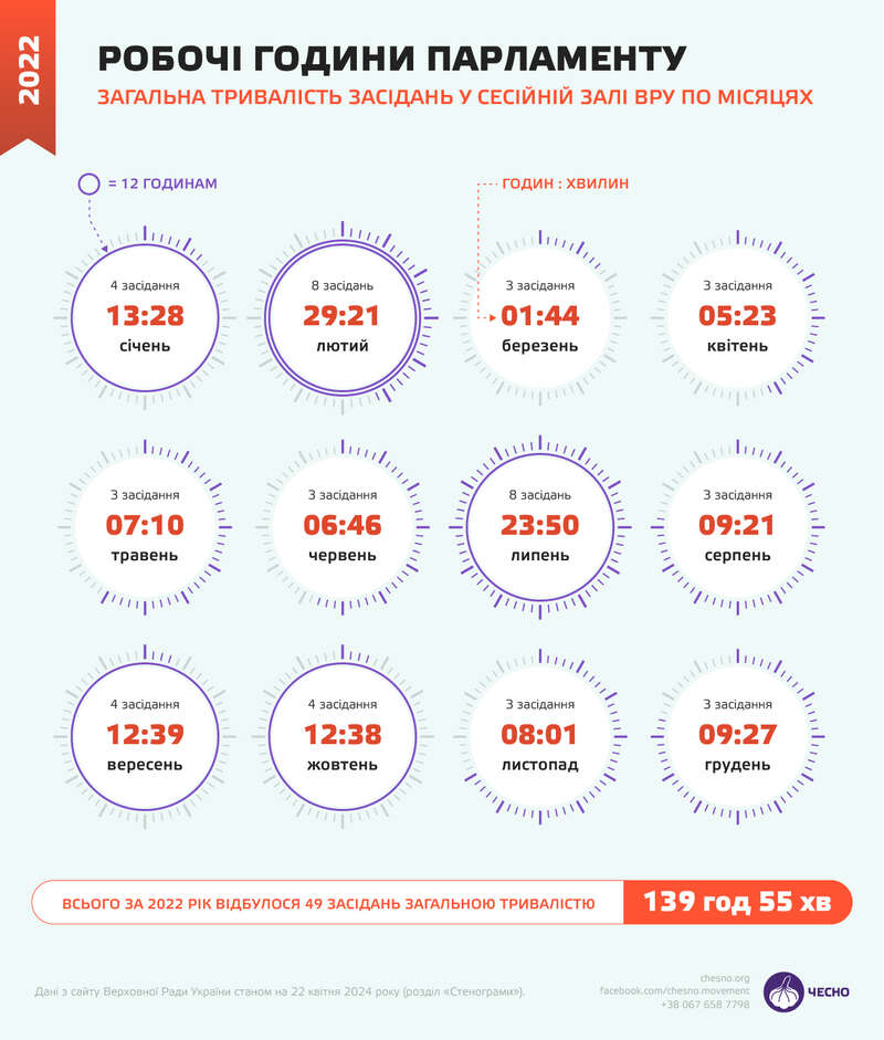 В 2022 году народные депутаты провели в сессионном зале Верховной Рады 49 заседаний, которые суммарно продолжались около 140 часов. В 2023 году состоялось 51 заседание парламента, что суммарно длилось около 183 часов. А с начала 2024 года на 22 апреля депутаты успели провести в парламенте 46 часов в течение 15 заседаний.