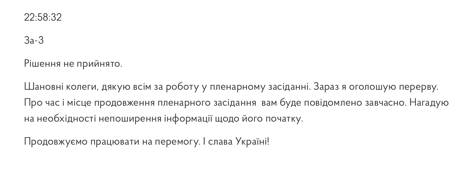 На видеозаписи видим минимальное количество депутатов на конец заседания, а на табло результатов голосования — всего несколько голосов. То есть, несмотря на значительную продолжительность заседания, подавляющее большинство нардепов покинули сессионный зал до его завершения.