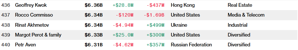 Единственным украинцем в списке является Ринат Ахметов, он занимает 438-е место с состоянием 6,34 млрд дол. С начала года оно увеличилось на 499 миллионов долларов.