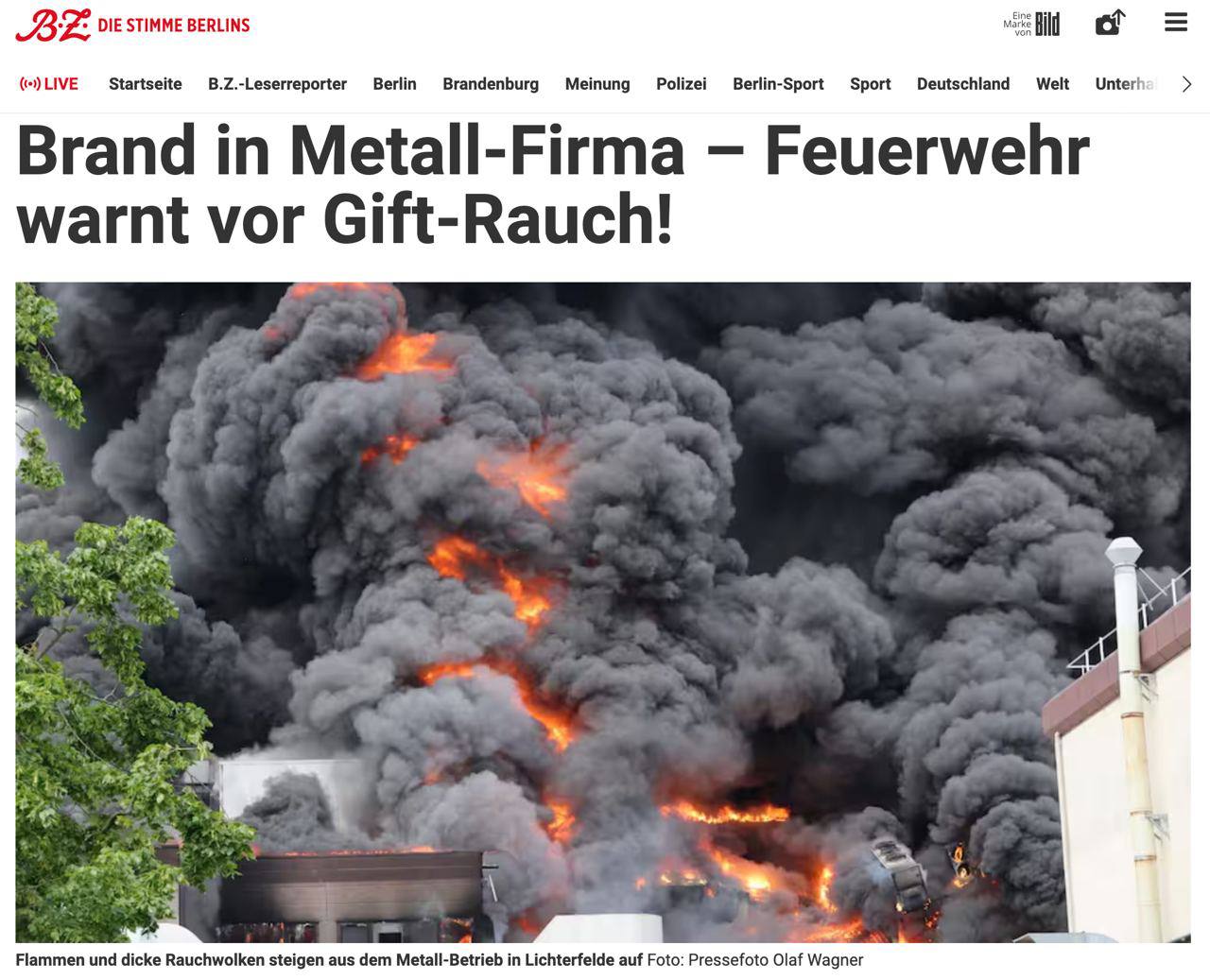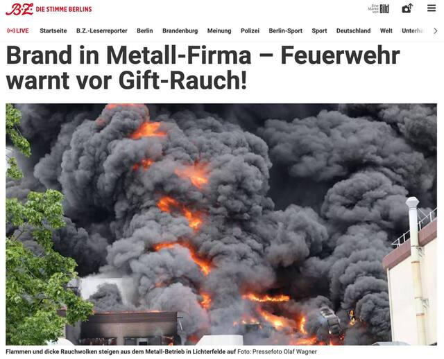 О пожаре на металлургическом заводе оборонно-промышленной компании Diehl сообщает издание bz-berlin.