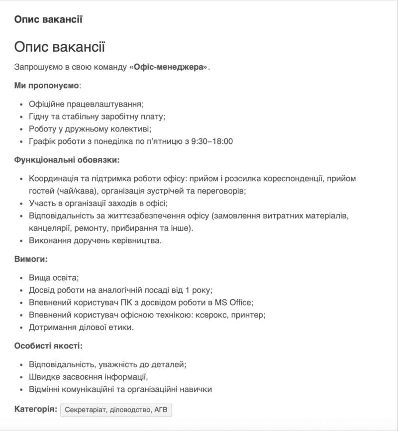 И действительно, можно найти опубликованную вакансию от Профмаркет Сервис в конце февраля этого года (за неделю до прекращения деятельности). Тогда они искали офис-менеджера по адресу: г. Киев, ул. Парковая дорога. На этой улице находится центральный офис партии "Слуга народа".