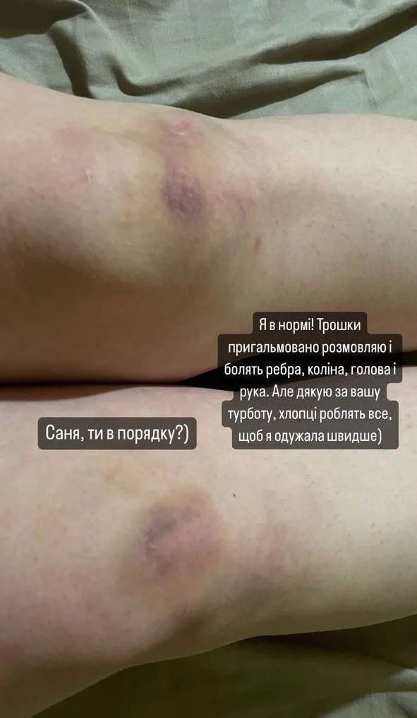 Украинская защитница рассказала о том, что в результате аварии у нее ушиблены рука и ребра, разбиты колени и сотрясение немножко после контузии. По ее словам, она не является виновницей аварии, а "такое бывает, когда кто-то невнимателен на дороге".
