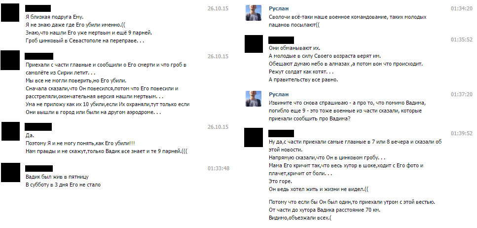 Следует отметить, что недавнее сообщение Reuters о 3-х погибших россиянах, относится к 20-му октября, а Вадим погиб 24-го. Т.е. данный пост не является подтверждением недавних сообщений Reuters. Также 23 октября (за сутки до смерти Вадима) Wall Street Journal опубликовали статью про участие России в военном конфликте в Сирии, где сообщили об имеющейся информации о наличии первых жертв среди российских войск в Сирии. При этом WSJ получило комментарий от источника в Министерстве Обороны РФ, который подтвердил смерть, но сказал, что военный погиб не из-за боевых действий, а в результате неосторожного обращения с оружием. Ссылка на статью (находится за пейволлом). Цитата из статьи: The Defense Ministry publicly denies any Russian deaths have occurred as a result of its operations. But the ministry official who confirmed the special forces also said that one Russian soldier has died in Syria due to careless handling of weaponry. Статья опубликована за сутки до смерти Вадима, причём источник WSJ в Министерстве обороны в тот момент уже подтвердил смерть военнослужащего, получается по датам не сходится. Но если представить, что в результате неосторожного обращения с боезапасом произошёл трагический инцидент и пострадало больше одного военнослужащего, то в тот момент Вадим вполне мог быть раненным и скончаться уже после публикации статьи WSJ. С другой стороны, родственники и близкие Вадима прямо говорят, что его убили. По нашему опыту расследований по украинскому конфликту, мы прекрасно помним, что когда военнослужащий погибает из-за несчастного случая, родственникам прямо так и говорят, и они сразу знают причину смерти. Плюс некий «слух» о ещё 9 других погибших солдатах.