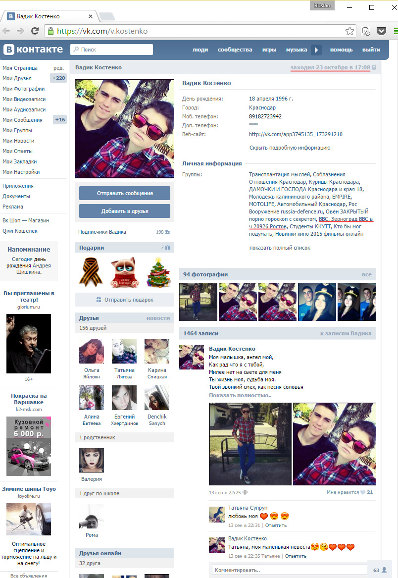 К тому же по активности в его профиле видно, что в августе он дважды приезжал к своей девушке в Краснодар (130 км. от Приморско-Ахтарска):