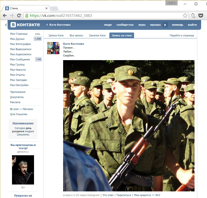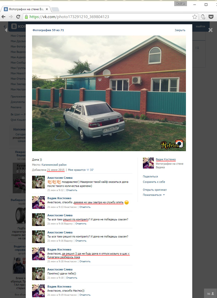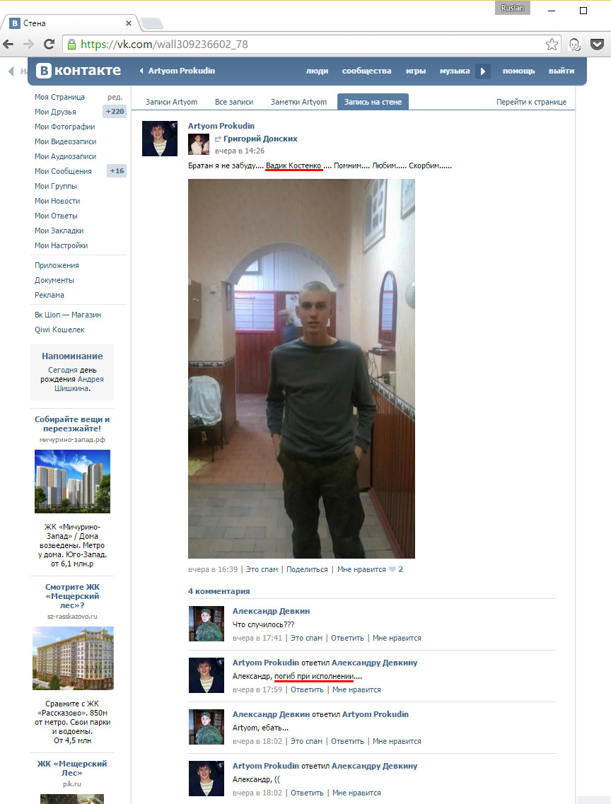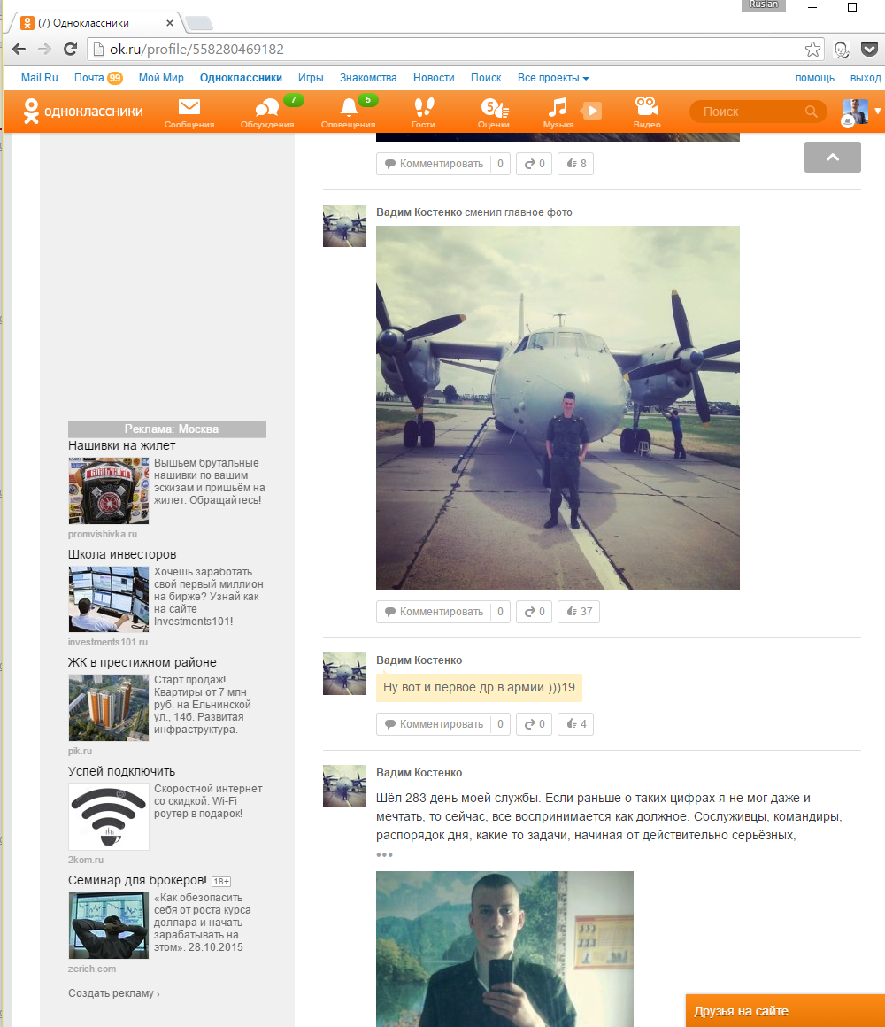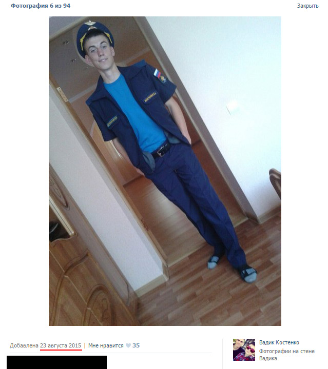 В сообщении говорилось о военнослужащем в/ч 20926 (834-й учебный центр ВВС, г. Зерноград, Ростовской области) Костенко Вадиме Александровиче, 18.04.1996-го года рождения (19 лет). Проверяя информацию, его профиль, профили его друзей и родственников, мы нашли множество подтверждений тому, что он был действующим военнослужащим по контракту, срочную службу закончил в июне 2015-го и сразу подписал контракт.