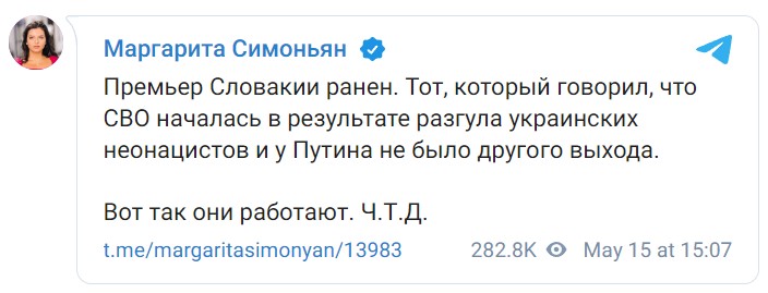 Пропагандистка Симоньян уже "нашла" причастных к покушению на словацкого премьера