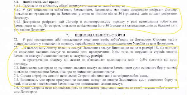 7.1. В случае невыполнения или ненадлежащего выполнения своих обязательств по Договору Стороны несут ответственность в случаях и порядке, предусмотренных действующим законодательством Украины и этим Договором.