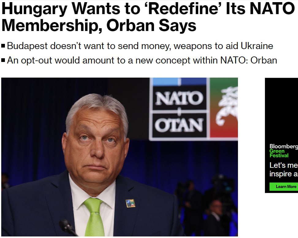 Bloomberg пишет, что Венгрия работает над "переопределением" статуса членства страны в НАТО, чтобы она могла потенциально отказаться от углубления поддержки Украины со стороны военного блока.