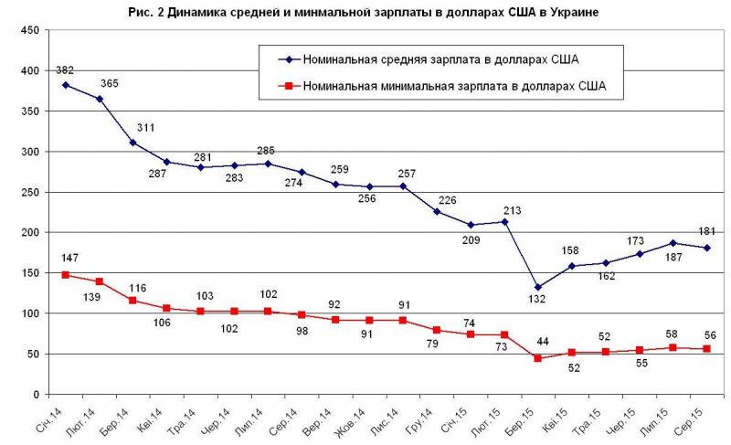 За последние 20 месяцев реальная средняя зарплата в Украине упала на 27,66% с 3167 до 2286 грн. Период тотального снижения длился с августа 2014 по май 2015. С мая по август 2015 года реальная средняя зарплата росла, однако происходило это из-за резкого снижения инфляции и даже сезонной дефляции в июле и августе, а также из-за фискальных новаций ГФС.