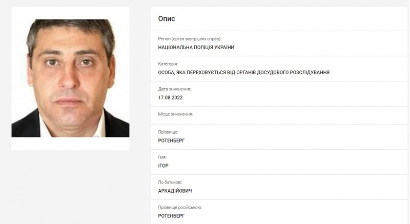 Следует подчеркнуть, что согласно карточкам в базе розыска МВД Аркадия Ротенберга разыскивает Департамент стратегических расследований Нацполиции, а его сына Игоря Ротенберга просто Нацполиция.
