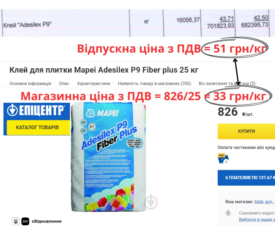 Клей Adesilex P9 учли по 51 грн/кг, хотя "Эпицентр" продает его по 33 грн/кг , это на 35% дешевле.
