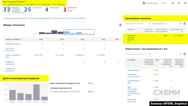 По подсчетам журналистов "Схем" за период с 2015 по конец 2022 года, российский "Коралл" получил от властей РФ контрактов на 196,48 миллиона российских рублей (это 2,2 миллиона долларов США). Последнее соглашение с «Дирекцией по обеспечению деятельности организаций труда» заключено в мае 2022 года. Кроме этого, ООО «Санаторий «Коралл» во времена эпидемии COVID-19 получило российскую государственную поддержку на сумму около 20 тысяч долларов США.