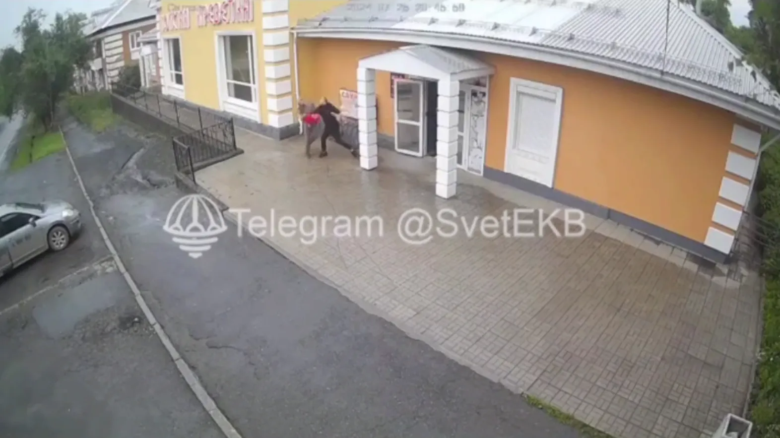 Через несколько секунд из кафе выскакивает охранник и валит неудачника на землю.