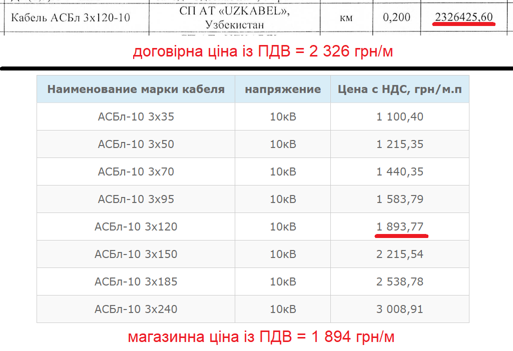 Также 1,94 млн грн отведено на кабели АСБл-10, прайсовые цены которых в среднем на 17% ниже. Так, кабель АСБл-10 3х120 стоит 2 326 грн/м, а у «Укрпровода» – 1 894 грн/м .
